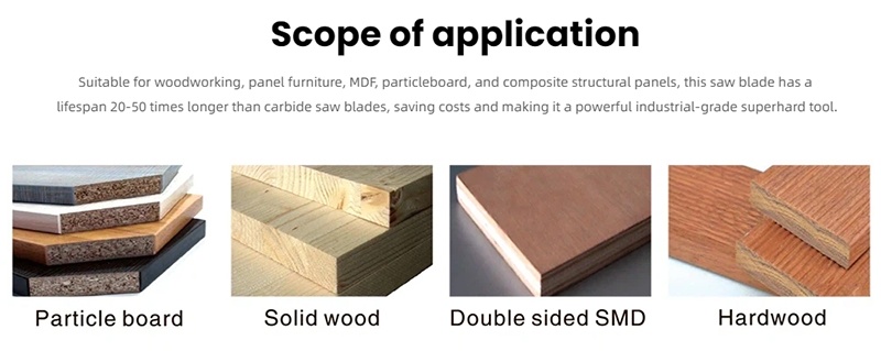 Diamond saw blades: suitable for woodworking, panel furniture, MDF, particleboard, and composite structural boards. The service life of this saw blade is 20-50 times that of carbide saw blades, saving costs and making it a powerful superhard tool for industrial use.