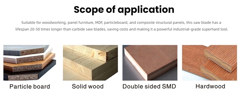 Diamond saw blades: suitable for woodworking, panel furniture, MDF, particleboard, and composite structural boards. The service life of this saw blade is 20-50 times that of carbide saw blades, saving costs and making it a powerful superhard tool for industrial use.